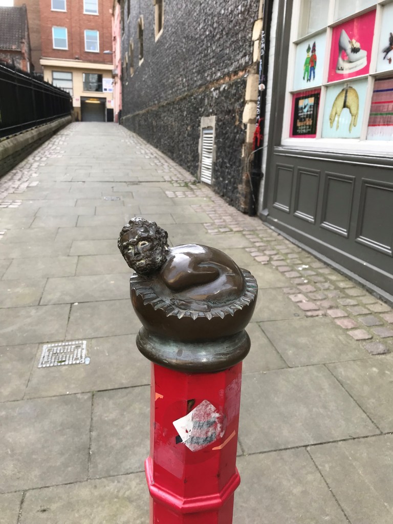 Unusually, I found myself wandering round Norwich with time on my hands. Enough for a stroll through the Lanes, where I re-acquainted myself with the small casting celebrating Peter the Wild Man, aka the Wild Boy, allegedly brought up by animals in the forests of Germany and brought to England by George I. Peter somehow made his way to Norwich as an adult, where he was arrested for wandering the streets and thrown into the Bridewell Jail. Suffice to say, the authorities were very happy to release him when they discovered there was a reward for his safe return to Hertfordshire. For more details, visit https://www.visitnorwich.co.uk/article/peter-the-wild-boy/.