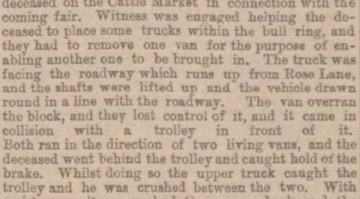 I’ve carried out further investigations into John Barker’s death. The coroner held an inquest two days later and decided it was an accident. He based this verdict on the testimony of one witness, Henry Clarke, whose account raises a few questions. Clarke described how a cart broke away from its blocks, rolled down a hill, then struck a trolley. Although both vehicles were on the move, Barker ran between them and tried to apply the brake on the trolley. It seems odd that there was sufficient space, and that the victim didn’t realise the consequence of his actions.